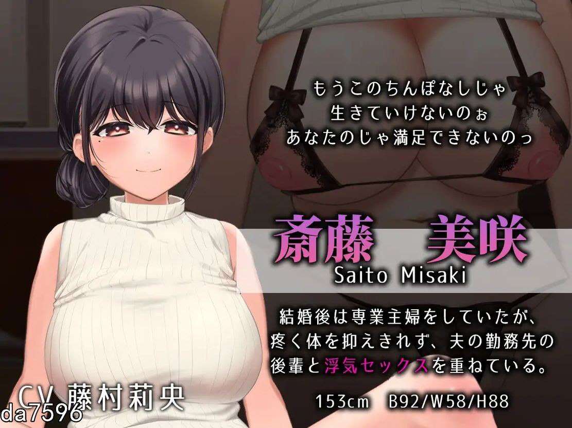 结婚后曾担任全职主妇,但因无法抑制身体的疼痛,与丈夫工作单位的晚辈多次发生婚外性关系。我以为丈夫没有察觉到我的出轨行为……我作为丈夫,与心爱的妻子美咲过着夫妻和睦的生活。…我曾那样认为。