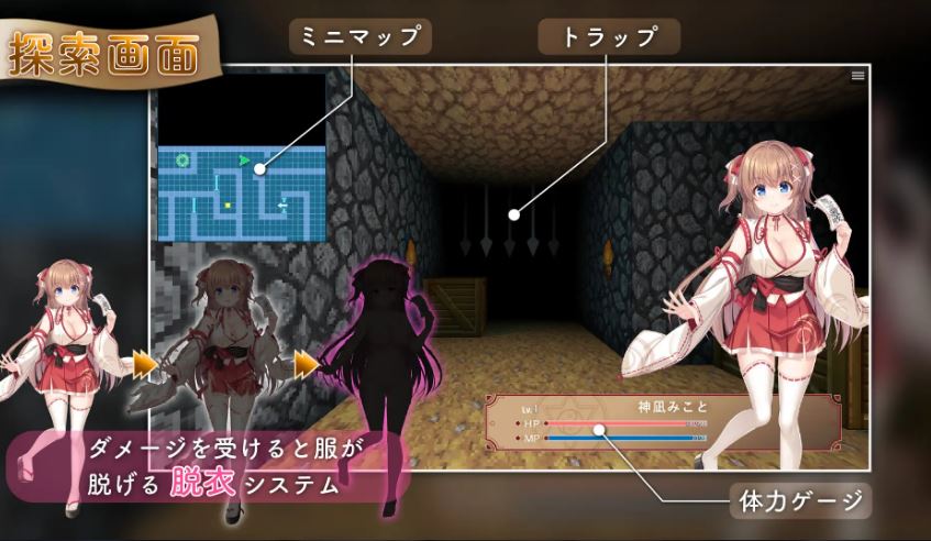 战斗中受到伤害时,衣服会逐渐脱落。在注意小地图和体力条的同时,避开各种陷阱,讨伐淫魔吧。