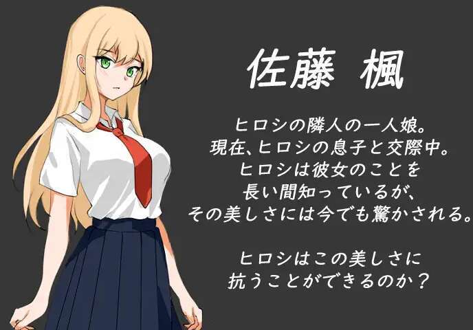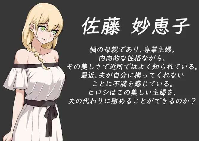 枫的母亲,全职主妇。尽管性格内向,但她的美丽在邻里广为人知。最近,她对丈夫不关心自己感到不满。弘能代替丈夫安慰这位美丽的妻子吗?